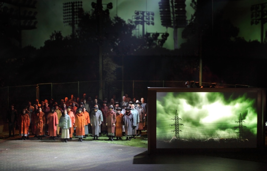 Без противления классическому прочтению оперы Верди, режиссёр и сценограф создают новую реальность, поверх текста и музыки и вместе с тем в полном, или почти полном единении с ними. Эта та самая добавленная стоимость, которой всегда ждёшь от режиссёра и его команды, и так редко её получаешь. Сценография продумана до мелочей. В ней всё на своём месте, всё работает. Полукруг декораций подобно центрифуге удерживает динамику действа, отжимает всё лишнее. Перед нами огороженная сеткой спортивная площадка. За сеткой прожектора на высоких опорах и угрожающе подступивший к ограде городской парк (он же Бирнамский лес), а над всем этим свод небес. Как гигантское зеркало он отражает всё, что происходит в сердцах и душах героев – воистину шекспировское небо. Вот вам арена битвы, на которой разворачивается сражение не на жизнь, а на смерть.