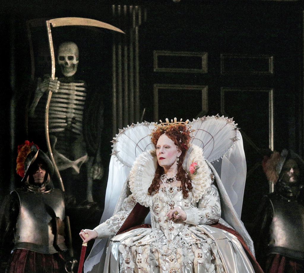 По сравнению с предыдущими продукциями цикла этот спектакль еще больше изобилует различными символами. На заднем плане сцены, за основной декорацией (черно-золотым залом с колоннами и балконом) висит огромная репродукция астрономических часов дворца Хэмптон-корт. По правую и левую сторону от центральных дверей, в нишах расположены статуи Смерти и Времени, которые очевидно позаимствованы из «Аллегорического портрета» пожилой королевы Елизаветы кисти неизвестного художника. Значение таинственных похорон, за которыми зрители наблюдают во время увертюры, объясняется только в финале оперы. Тот же самый саркофаг вновь появляется на сцене в момент, когда Елизавета говорит о своем конце. Так постановщики хотят донести до нас главную мысль спектакля: смерть – повсюду, и скоро пробьет последний час королевы.