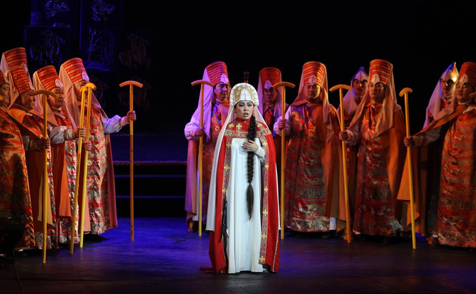 Якутский театр обладает богатством голосов, которому можно позавидовать. Особенно это относится к женскому составу. Располагая как минимум пятью прекрасными крепкими сопрано для партии Ярославны, постановщики придумали интересный ход: выразительный, но очень длинный плач они поделили между пятью исполнительницами. Женщины приходят на берег реки и, по древнему обычаю, пускают по воде венки – символ любви и верности. Сделано это просто и поэтично, голоса певиц, словно переливаясь из одного сосуда в другой, звучат ровно и свободно, сохраняя единую звуковую окраску. А основные исполнительницы партии Ярославны в двух спектаклях – Прасковья Герасимова и Анегина Дьяконова.