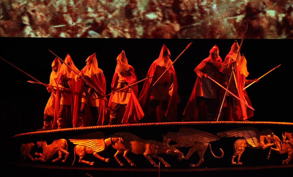 Эксклюзивное решение популярной классической оперы первыми увидела публика Пекина, где премьера состоялась в середине декабря прошлого года. Там спектакль шёл на огромной сцене, всё было отлично отлажено, не надо было выгадывать сантиметры для интересных мизансцен. С переносом на собственную, меньшую по размеру площадку возникли сложности и, как результат, качественные издержки. В основном, это техническая грязь из-за поспешной монтировки сценического круга, прибывшего из Китая в последнюю минуту и необходимость по ходу корректировать ряд сценически решений. В результате якутская премьера 7-го апреля выглядела генеральной репетицией с обидной провинциальной неряшливостью. К счастью, на представлении следующего дня почти всё встало на место, и спектакль удивил яркой своеобычностью.