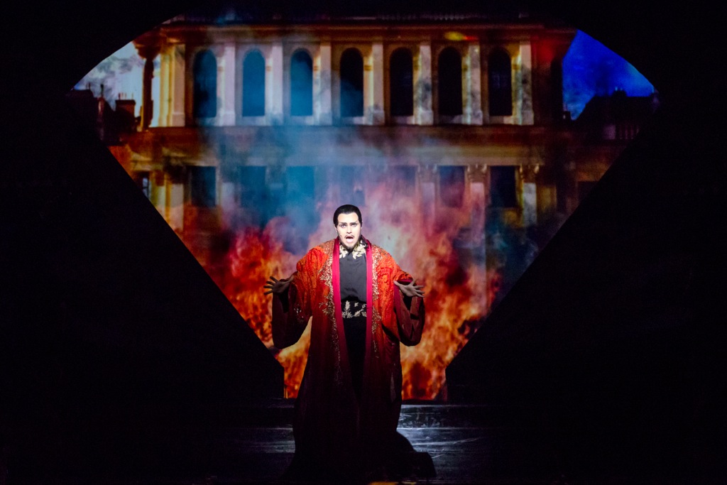 Однако данный случай близок к формуле «победителей не судят». Кереньи – мастер сценического зрелища, достаточно наполненного смыслом, крепко сработанного и по-своему красивого. Декор, особенно в китайской части спектакля, выполнен в пряных тёмных тонах, с излюбленными Керо светильниками с открытым огнём. Основа оформления – веера-ширмы, кружевные в первой части и покрытые китайской росписью во второй. Веера – приём донельзя избитый, но пространственное решение художника Агнесс Дьярмоти продуманно, целесообразно, эффектно. О том, как чётко всё это работает, уже сказано.