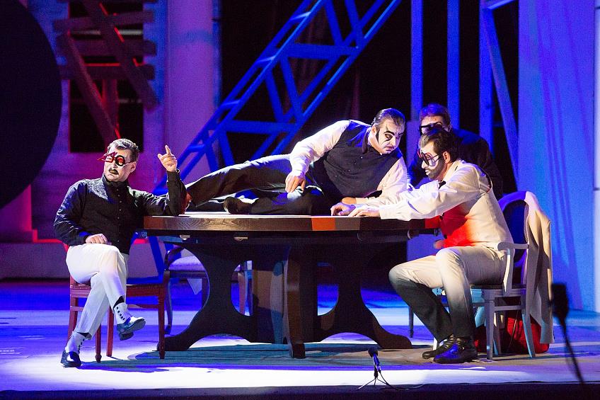 Второй спектакль – «Игроки» Шостаковича – стал открытием и откровением. Художественное оформление (сценография Дарьи Синцовой, костюмы Светланы Грищенковой) из достаточно условного, обобщенного стиля в первой части сдвинулось в область абстракционизма, точнее его крайней формы – супрематизма, но не только. Все решено на изобилии острых углов и контрастов: черно-бело-красные костюмы с острыми углами фраков и жилетов, круглый вертящийся карточный стол, разномастные стулья, геометрические фигуры на лицах актеров. Потом ближе к финалу такие же цветные фигуры спустятся сверху и повиснут над сценой, окончательно превратив пространство в картину «русского авангарда» начала века. Боковые стены, сложенные из холстов, из первого отделения оставлены, но сзади размещен сюрреалистический арт-объект – усадебная беседка с колоннами, с досками, наподобие тех, которыми заколачивают ставни в брошенных деревенских домах – но непонятно, как они держатся на пустоте и камне. Дозировано применяется видеопроецирование – красиво, как осенние листья или хлопья снега, летят полупрозрачные игральные карты.