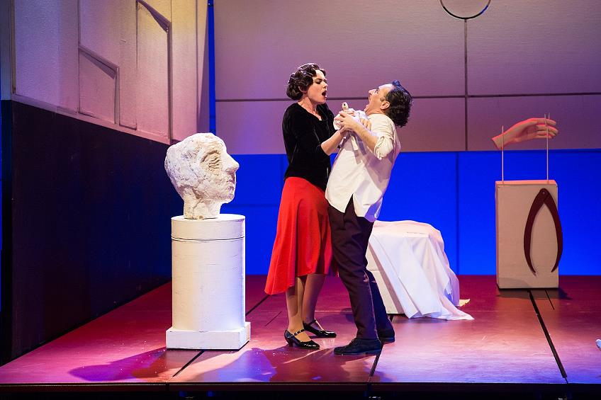 Само имя Маддалена, Магдалина содержит отсылку к библейской истории грешницы, ставшей святой, и по музыке воплотить такое преображение, в принципе, возможно. Но режиссер принимает решение по очевидному пути не идти – у него героиня остается без преображения, грешной, не столько даже неприкаянной Саломеей, сколько жизнелюбивой Кармен, которой поначалу было скучно, как Катерине Измайловой, а потом (на этот раз!) повезло. В ту же тему и визуальное оформление героини (сценография и костюмы Этель Иошпа, готовившей в Новой Опере и «Саломею») – красная диагональ юбки и дерзкие короткие кудри. Некая незавершенность есть и в оформлении сцены–мастерской художника или скульптора – там стены сложены из грунтованных художественных холстов разного размера, они так и остаются чистыми, их частично разбирают по ходу действия, но никто не мажет ни краской, ни «кровью». В общем, в опере, в отличие от драмы, вывешенное на сцене ружье не всегда выстреливает в последнем акте. Впрочем, и сама опера – одноактная.