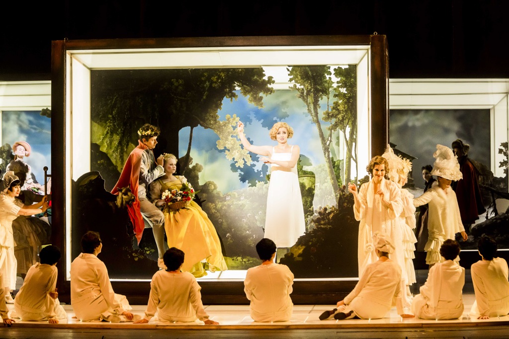 Находка же с «живыми картинами» в Калиновском замке, в которые, пытаясь напугать братьев с их слугой, то и дело внедрялись дочери Мечника, стала подлинной изюминкой спектакля. Картины-аллегории французских художников, которые в спектакле «висели» в замке, относятся уже к XVIII веку – эпохе сюжета оперы Монюшко, и в качестве таковых режиссер использовал два набора композиций – тетраптих Франсуа Буше «Четыре времени года» (1755) и четыре картины Жозефа-Мари Вьена, написанные в 1773–1774 годах. Среди них есть одна, название которой зеркально отражает обет Стефана и Збигнева: «Две молодые гречанки отрекаются от любви». Но как ни отрекались от любви братья-патриоты, любовь победила. И несмотря ни на что, великая сила оперного искусства победила тоже!