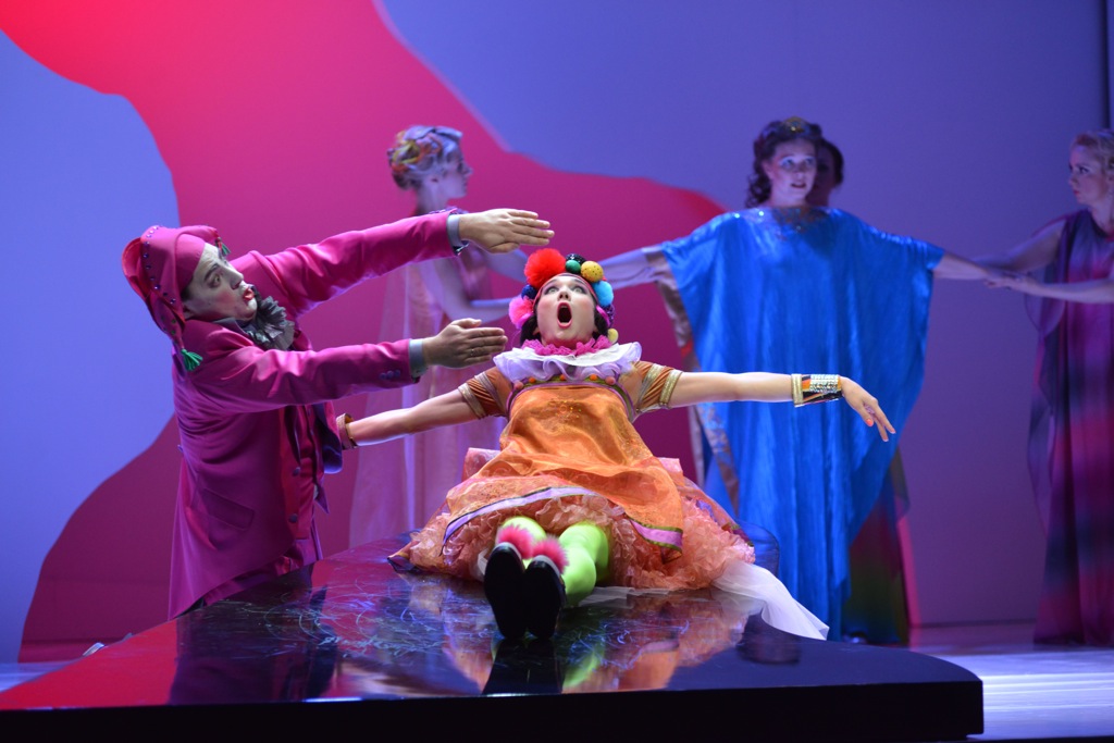По большому счету, претензия к режиссуре и сценографии только одна – абсолютно антиэротическое оформление образа Цербинетты. В прологе героиня появляется в виде татуированной эмо-герл в бесформенном черно-розовом прикиде, потом перевоплощается в детского клоуна с помпончиками, глупо семенящего ножками даже во время самых красивых мелодий. И там, и там не находится ни капли женственности и соблазнительности, даже странно слышать от такого персонажа нравоучения на тему, как надо нравиться сразу многим мужчинам – кто бы говорил! В остальном осовременивание этой опере, комической и условной, пошло только на пользу.