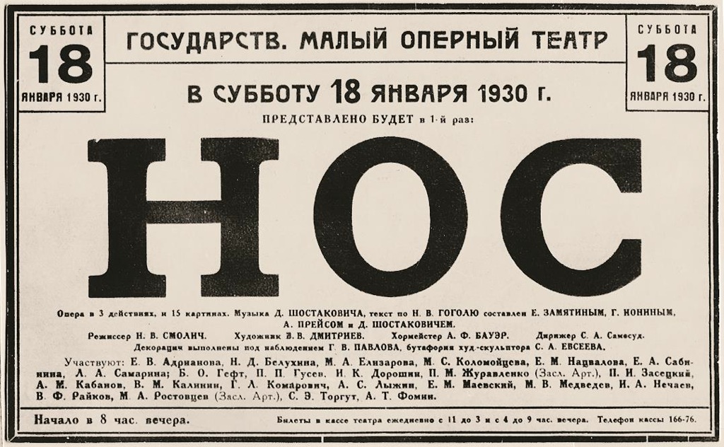 Сегодня мы публикуем вторую статью Дмитрия Изотова из цикла «Из прошлого отечественной оперной практики». Она посвящена исторической премьере «Носа» Дмитрия Шостаковича.