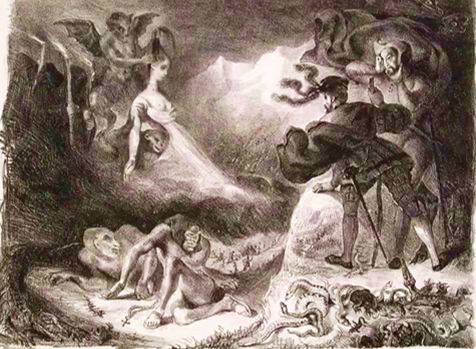 Эжен Делакруа. Тень Маргариты, явившаяся Фаусту. Литография. 1827-1828.