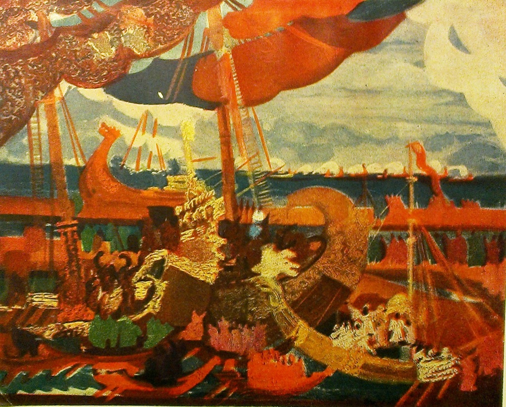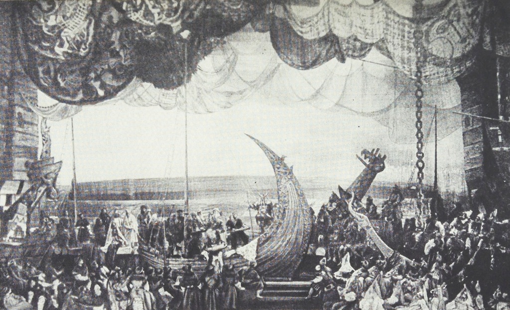 Спектакль «Садко» 1935 года одновременно пугал и очаровывал масштабом живописных форм, а в этой постановке было на что посмотреть. Феерическая сказка Лосского и Федоровского потрясала размахом и буйством красок. Пир новгородских купцов шел в огромной палате, на сводах и колонах которой, как упоминается в былине, изображались солнца и созвездия. Торговая пристань Ильмень-озера наполнялась причаливающими к берегу великолепными стругами-кораблями с резными носами и разноцветными парусами: слоновый хобот индийской ладьи, золотая Мадонна на носу венецианского корабля и варяжский струг с резными орнаментами.