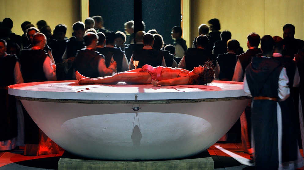 В интервью, которое зрители могли прочитать в программке фестиваля, господин Лофенберг объясняет, что не рассматривает эту оперу в чисто религиозном ключе, а видит ее как произведение более глобальное, где в то же время исследуется происхождение религии. В постановке ярко выражены все христианские элементы этого опуса, повествующего нам о рыцарях Грааля, которые поклялись охранять священную реликвию и которые переживают духовный кризис, так как их лидер, Амфортас, страдает от незаживающей раны. В трактовке немецкого режиссера Амфортас, партию которого исполняет американский бас-баритон Райан МакКинни, – привлекательный мужчина тридцати лет, который во время церемонии в первом акте появляется в образе Иисуса, в набедренной повязке и с терновым венцом на голове, истекая кровью из-за раны, которая никак не затянется.
