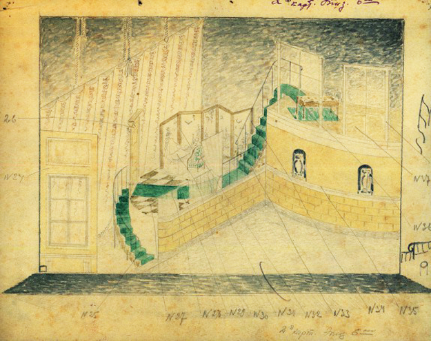 Художественное решение безумства Германа было еще более впечатляющим. Мейерхольд просил художника Леонид Чупятова намерено увеличить лестницу в комнате Графини, что позволяло раскрыть образ Германа больше, чем предусматривала музыка. После реплики: «Она мертва!», безумный Герман начинал бегать по огромной лестнице - взлетал наверх, и стремительно сбегал вниз…