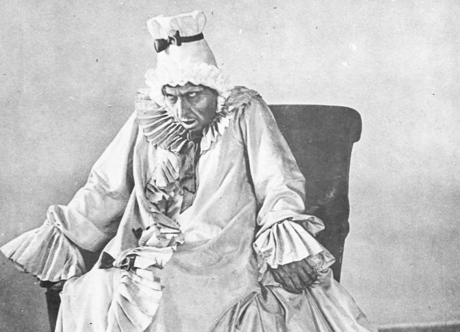 Кульминация спектакля Мейерхольда – сцена в спальне Графини. Графиня, как описывает ее сама исполнительница Надежда Вельтер, выглядела так: «С красными пятнами румян и мушкой на бледно-желтом лице, в желтом платье, в высоком белом парике, сверкающая бриллиантами, с веером из страусовых перьев, казалась пришельцем из другого мира».