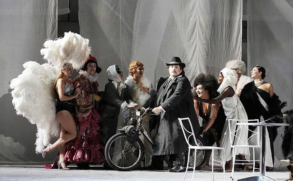 Ливермор не только режиссер, но и сценограф; позади мельтешащих персонажей, непрерывно занятых разыгрыванием гэгов, идут кадры черно-белого фильма, атмосфера на сцене сродни лихорадочному безумию, которое нередко царит на съемочной площадке. Черно-белая гамма способствует ощущению монотонности, но световая партитура Николаса Бови, видеопроекции D-Wok и особенно костюмы Джанлуки Фаласки вносят в спектакль недостающее разноцветье.