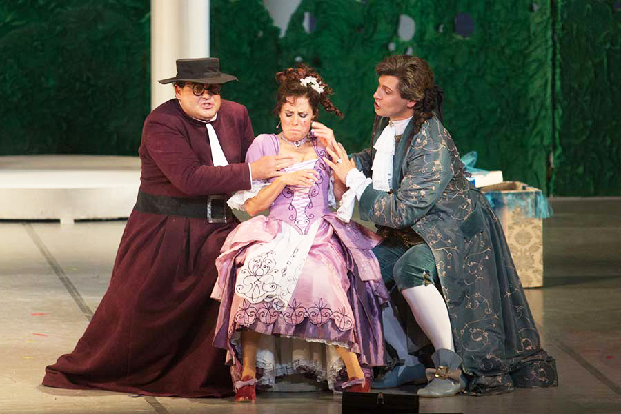 Возвращаясь к декорациям, следует отметить, что иногда решение отдельных сцен выглядело слишком уж минималистично. Создается впечатление, что на сцене не хватает некоторых вполне естественных для графского дома предметов интерьера. Например, во втором действии оперы, которое разворачивается в комнате графини Альмавивы, вполне уместным был бы небольшой туалетный столик, секретер или бюро Розины. Вместо этого присутствовала конструкция из четырех белых цилиндров, изображающих кресло и стол одновременно. Проблема не в том, что интерьер комнаты графини практически полностью повторяет интерьер комнаты Фигаро и Сюзанны с огромной кроватью в центре, все мы прекрасно понимаем и принимаем степень условности театральных декораций. Она в другом – графиня Альмавива «прячет» важные для развития сюжета оперы вещи (записка с песенкой Керубино, ключ от кабинета, в котором скрывался юный паж, а затем Сюзанна) просто на полу, так как положить их ей больше некуда. Можно возразить, что это придирки к второстепенным мелочам, но так ли эти мелочи несущественны, если на них обращаешь внимание.