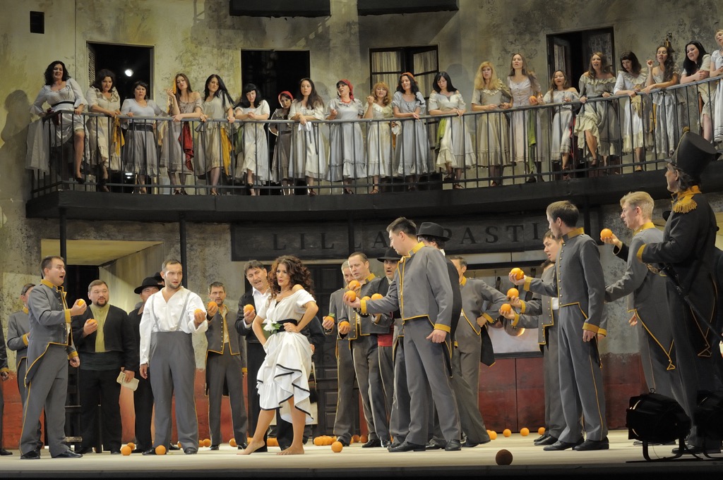На сцене появился испанский дворик с трехэтажным домом в натуральную величину. Эта конструкция не только легко трансформируется во все ключевые локации либретто (табачная фабрика, казарма, кабачок Лильяса Пастья), но и представляет собой «акустическую ракушку», благодаря которой режиссер получил в свое распоряжение еще два измерения сцены: глубину и высоту. Это позволило ему полностью «обжить» сценическое пространство и свободно работать, в частности, в массовых сценах с участием хора.
