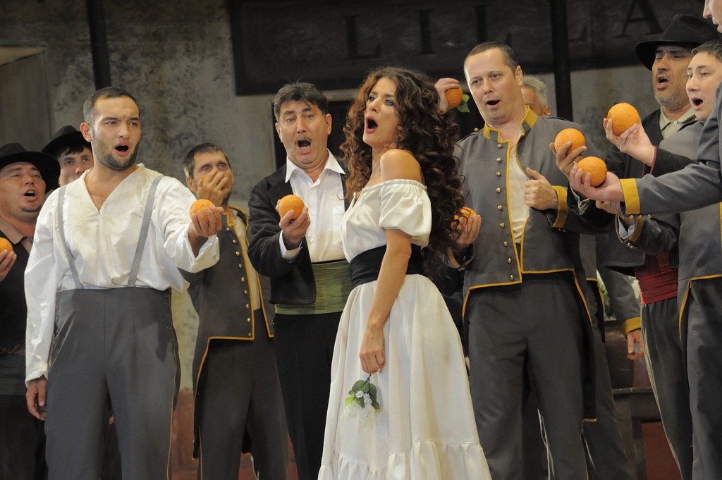 Спектакль начинается с яркого оранжевого мазка – по всей сцене раскатываются апельсины, выпавшие из перевернувшейся тележки торговца. Вид покрытой апельсинами севильской площади сразу же задает солнечный и праздничный тон первого действия. Яркое солнце и резкие тени – основной мотив цветового оформления спектакля: оранжевый, кирпичный, желтый и красный сочетаются с белым, черным и серым. Все цвета насыщенные и сочные, но без крикливой яркости и вульгарности.