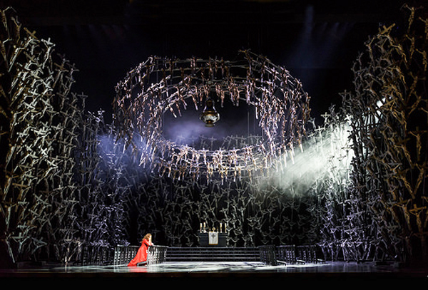 Сценография Альфонса Флореса представляет собой несчетное скопление распятий по всему периметру сцены от пола до потолка - не то «священный» лес, не то напоминание, как по Данте, о живом чистилище. В какой момент с верха сцены был опущен в четыре круга сплетенный – опять-таки из…распятий – огромный, мощный «терновый» венок, угрожающе зависший посередине сцены. Но этом же фоне странное ощущение производят современные апартаменты Нормы – с мягкими диванами, с плоским экраном включенного телевизора, по которому ее засыпающие дети смотрят мультики. К сцене убийства Норма готовится с удивительным хладнокровием, присущем разве только настоящему убийце – она предусмотрительно расстилает на полу огромный размеров полиэтилен, дабы не забрызгать невинной кровью своих деток модерновые апартаменты.