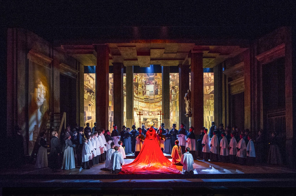 Но если в 1992 году режиссёр Андреа Андерманн затеял совершенно сумасшедший проект съёмок фильма-оперы «Тоска» в настоящей римской обстановке (церковь Сант-Андреа-делла-Валле, палаццо Фарнезе и замок Сант-Анджело), то в этот раз, на сцене лондонского Колизеума знаменитую римскую церковь представляли с большой степенью достоверности искусные декорации. Надо отметить, что творческой команде в лице режиссера (Кэтрин Мальфитано), сценографа (Франк Филипп Шлоссман), художника по костюмам (Гидеон Дейви) и по свету (Дэвид Мартин Джейкс) удалось это сделать с невероятной изобретательностью и художественным вкусом.