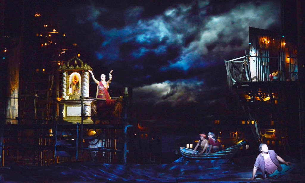 Мы наблюдаем эффект невероятного сходства, словно это и не декорации вовсе, а реальная деревушка, вскарабкивающаяся, как по ступенькам, от подножия моря выше и выше по склонам горы, с прилепившимися, словно гнездами, хижинами и хибарками, притягивающая своей неповторимой, незабываемой восточной экзотикой. Светящиеся точки в окнах одна за другой гаснут, море плещется, волнуется, и в воздухе ощущается морская свежесть. Уж не использовали ли создатели освежители для кондиционеров? Так или иначе, но эта абсолютно великолепная, ослепительно красивая, хотя и несколько утопическая картинка с чарующей атмосферой побережья Индийского океана, выполнена блестяще (сценограф – Дик Бёрд, художник по свету - Дженнифер Шривер, очень популярная как на Западе, а так и в Петербурге, где она участвовала в постановках Мариинского театра – «Сон в летнюю ночь», за которую была номинирована на премию «Золотая маска», и «Фауст»).
