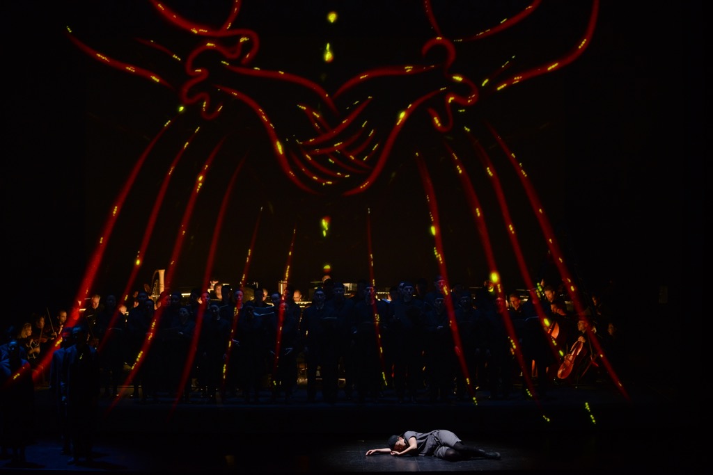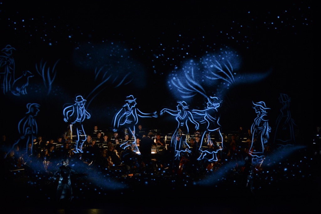С другой стороны, а зачем им больше? Главным (и почти единственным) действующим лицом постановки была именно анимация. С использованием новейшей технологии projection mapping, которая, как не без хвастовства заявляет Грегуар Пон, никогда ещё не использовалась в театре столь интенсивно. На протяжении большей части спектакля основной задачей постановщиков было не представить певцов в максимально выгодном свете, а, напротив, максимально их спрятать, чтобы не отвлекали от главного.