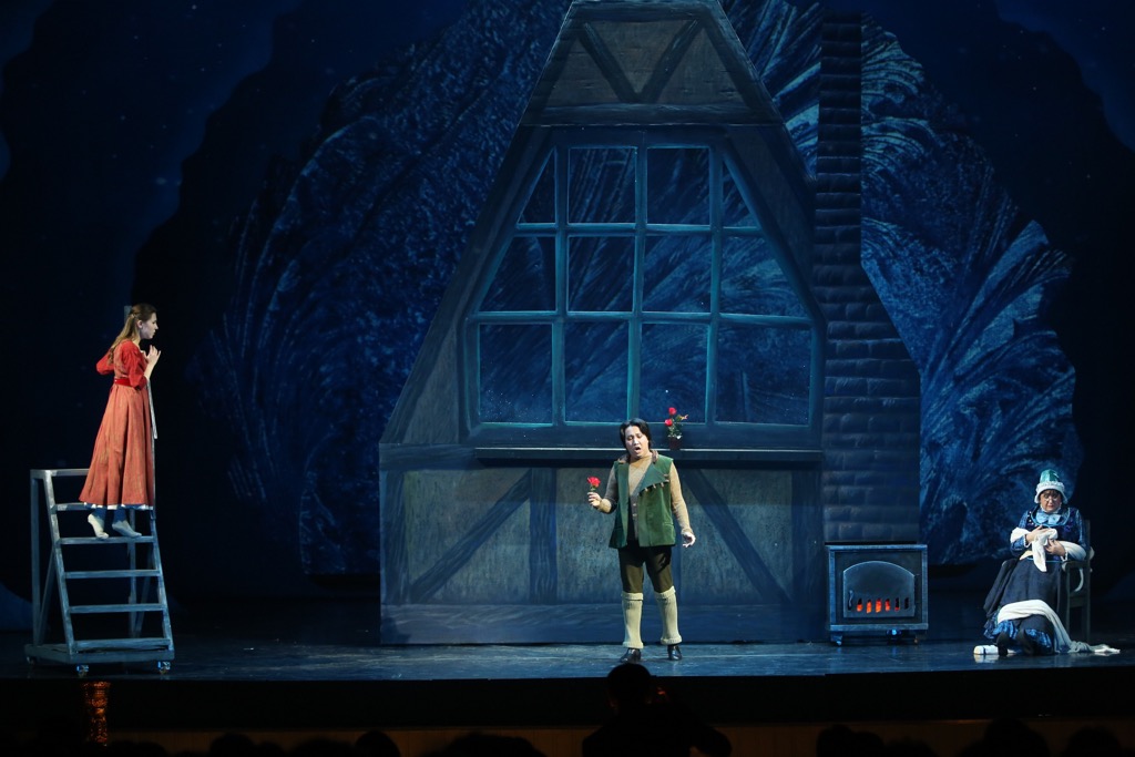 По совместительству в этой опере ещё и поют. Правда, поют как-то не очень. Героиню почти не слышно, Маленькая Разбойница больше говорит и кричит, чем поёт, у мужчин голоса вибрируют или выдают безтембровое звучание. Единственное удовольствие для слуха, это Снежная королева Анны Кикнадзе с её грудным бархатным голосом и ровным объёмным звуковедением. Сказать, что оркестр безукоризненный, тоже не удаётся. Дирижёр Заурбек Гугкаев на премьере не столько вёл музыку, сколько она вела его. Аккуратно так, чтобы оркестровая ткань не расползалась.