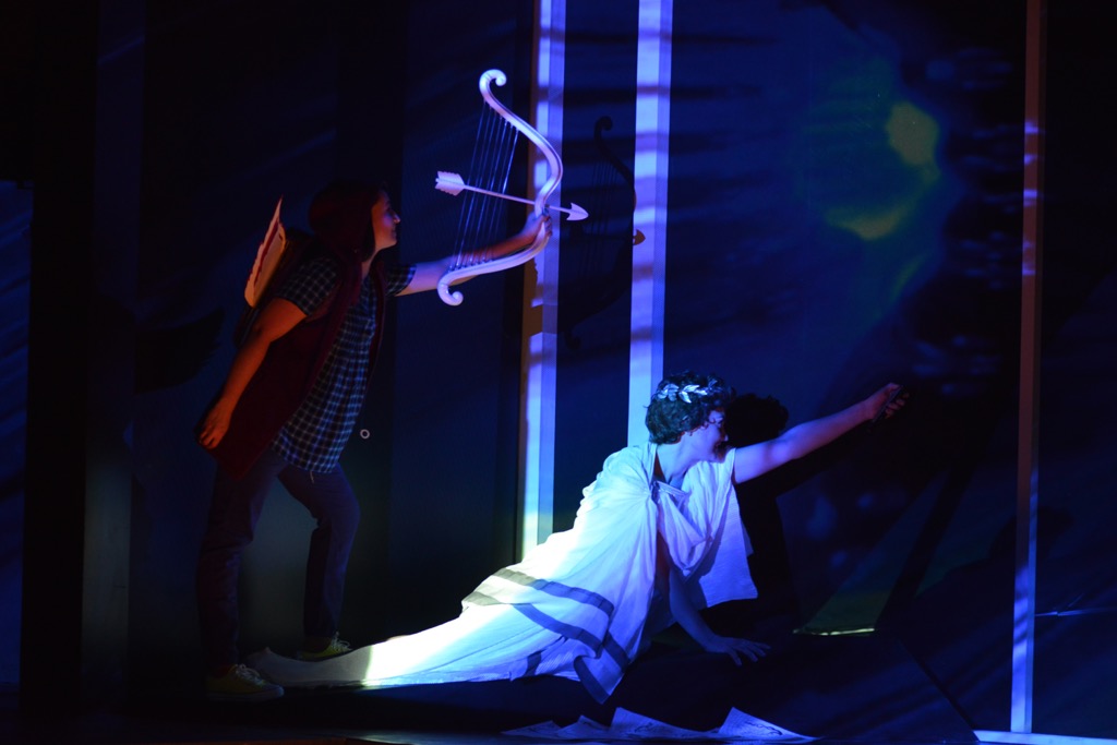 Третий, но по драматургической значимости чуть ли не самый главный персонаж – Амур. Он же волей режиссёра девушка-художница, наша современница. У Тамары Касумовой звонкое высокое сопрано, точная интонация и фразировка. Девочка-подросток в брюках и с рюкзачком, который в загробном царстве превращается в крылышки, очень мила и непосредственна. Может быть, излишне суетлива в жестах и лицом иногда, как студентка, сдающая актёрское мастерство. Но в её искренность верится.