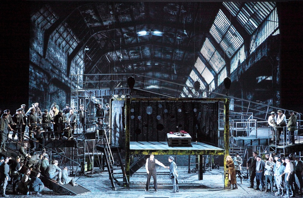 В остальном режиссура Купфера весьма далека от реализма. Откровенно говоря, какой объект реализма может содержаться в огромном ржавом заводском контейнере-подъемнике, кочующем вверх-вниз вместе с Катериной? Если бы Гарри Купфер стремился прослыть реалистом, он упрятал бы скучающую Катерину в добротный купеческий дом. Подобие спальни, решенной с условной театральностью «сцены в сцене», представило собой открытый железный каркас как символ (клетки, роковой судьбы, унижения, возможно ржавеющей от не-востребованности души Катерины). Режиссер подразумевал некую «старую верфь, где ранее ремонтировались или утилизировались суда. Огромный зал, в котором остался железный каркас, еще не сданный в металлолом – это и есть место бегства Катерины, своего рода ее временное убежище». С героями Шостаковича Гарри Купфер сталкивается не впервые. В 1988 году он ставил спектакль в Кельнской опере. С того времени понимание режиссёром характеров «Леди Макбет» существенно не изменилось. Но топос деревни прошлой постановки сменился топосом города, причем, как доказывает сценография, далеко не провинциального. Идея режиссёра прозрачна, логична и легко предсказуема. Ее цель – усугубить мотивы социального конфликта и женского неравенства. Сценическое пространство в виде заброшенного индустриального колосса с многочисленными железным массивными переходами, мостами, обрывающимися в ничто – как бы внешняя проекция упадка и заката империи, в которой нет места красоте, любви, величию.