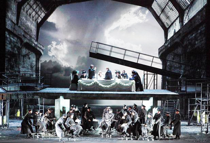 Но вернемся к Шостаковичу и его мюнхенским интерпретаторам. После убийства Бориса Тимофеевича закрытое пространство сцены расширяется, становится сквозным. Открывается бескрайнее небо, затянутое грозными тучами. Исчезает «клетка-спальня» Катерины. Словно совершенное ею преступление сулит иллюзию освобождения. На этом фоне динамично раскручиваются события третьего акта, сцена в полицейском участке, свадебный пир, арест Катерины и Сергея. Многолетний опыт режиссёра и его знание «поэтики намека» Шостаковича подсказали замечательную идею – усиление момента драматического столкновения Катерины и Сергея с полицейскими посредством многоуровневой сценографии (художник-постановщик Ганс Шавернох). Эстетику стоп-кадра режиссер инсценировал как устойчивый знак, ведущий не к расширению поля музыкальной семантики, а, наоборот, к ее уточнению и редукции. Накрытый свадебный стол, за ним –молодожёны, гости, колоритный поп-пьяница (Горан Юрич) перемещаются на подъёмнике вверх после песенки Задрипанного мужичка (Кевин Конерс). Режиссер мгновенно фиксирует в стоп-кадре верхний уровень сцены. Участники замирают в неподвижных позах, производя впечатление восковых фигур, и оживут вновь только после сцены в полицейском участке. В это время открывается нижний уровень, из которого по сцене рассыпаются полицейские на компьютерных креслах. Весь эпизод в полицейском участке ощущается музыкально целостным и гротескным. На сцене наглядно представлена иерархия старших и низких чинов через разделение ансамбля на две группы. Первая, удобно расположившись в креслах, читает газеты, вторая возит их по сцене (младшие чины прислуживают старшим). Роль нахального полицейского начальника – Квартального превосходно исполнил украинский бас Александр Цимбалюк. Ровный, сильный, уверенный бас, статная фигура, резкая жестикуляция типичного шефа на фоне неоднократно провозглашаемого жизненного кредо полицейских «где-бы, как-бы поживиться», создали цельный сценический образ законодателя-мошенника и его свиты. Остановка во времени сцены свадьбы Катерины и Сергея как ключевой сцены благодаря оригинальному режиссёрскому ходу ярко обозначила поворотный момент в развитии хода событий.