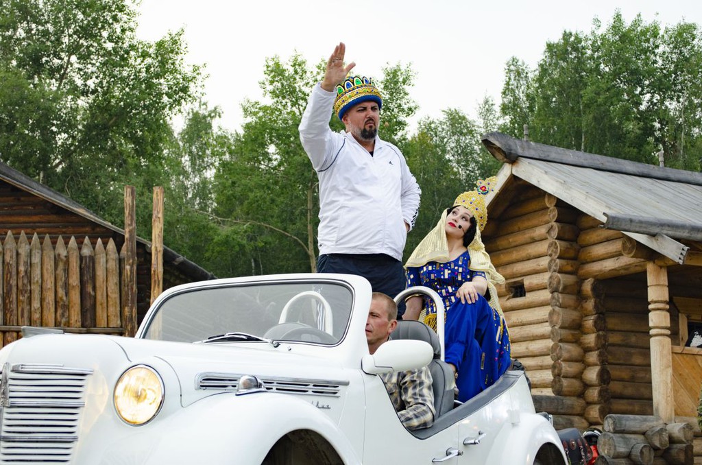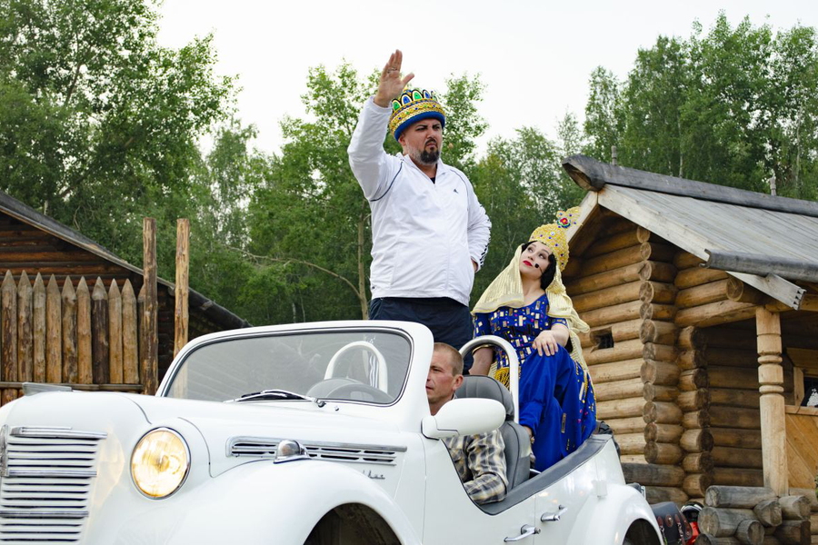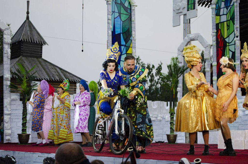 Нестандартный подход к постановке заключается еще и в том, что, помимо основной сцены, создана и задействована еще и боковая, да и почти вся площадка вокруг зрительного зала под открытым небом – ведь возвращается домой Додон с Шамаханской царицей в настоящем старом «Москвиче»-кабриолете в сопровождении команды байкеров.