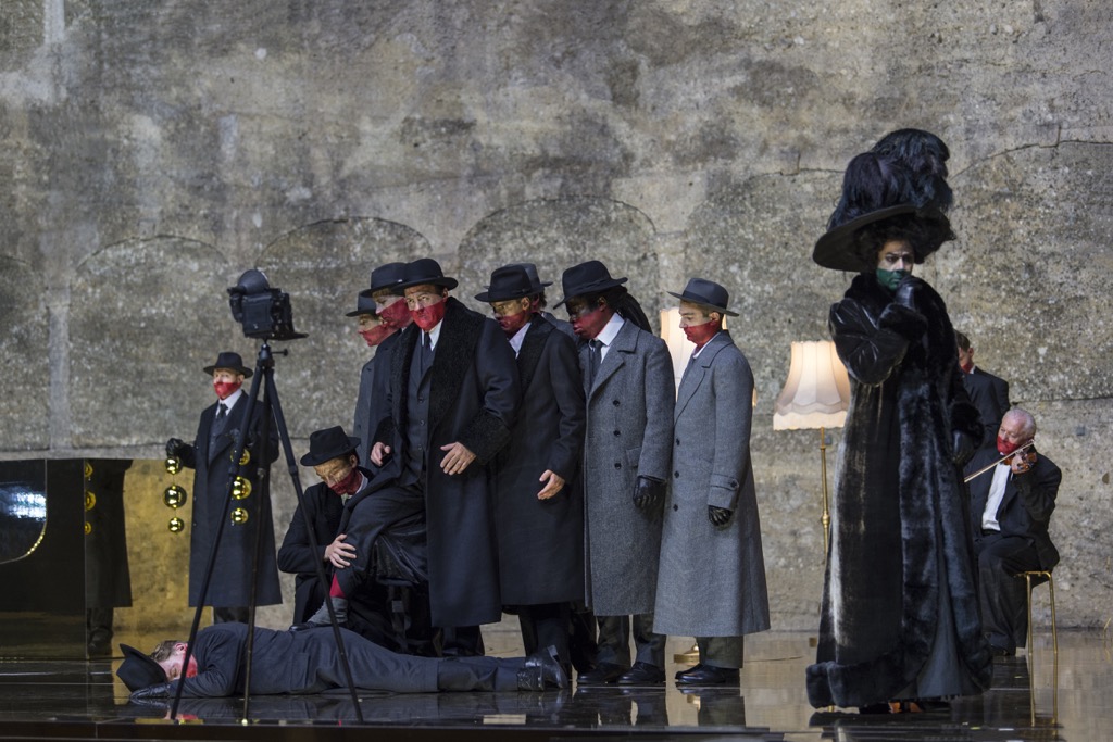 В «Саломее» режиссер первым делом подчиняет себе пространство высеченного в скале театра Фельзенрайтшуле. Впервые в истории его каменные аркады закрыты, замурованы, скала вновь стала скалой. В вышине виден герб с надписью «Te saxa loquuntur» («О тебе говорят камни») – копия герба над туннелем Зигмундстор, который ведет в центр Старого города Зальцбурга. При первых звуках музыки на герб наползает черная луна. Город пойман театром в ловушку, а вместе с ним и мы, зрители, оказываемся заперты в перевернутом мире.