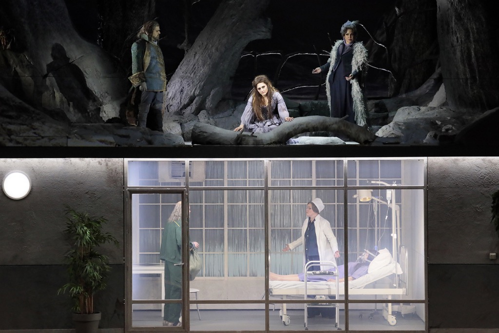В постановке Кулябина главная героиня, насмотревшись в кинотеатре голливудских фильмов (а может быть диснеевских мультфильмов), представляет себя красавицей-Русалкой, в реальности она бедная замухрышка, дочь бомжеватого водопроводчика. Принц – эгоистичный и циничный сын богатых родителей. Он разыгрывает свадьбу с «Русалкой», чтобы позлить предков и разыграть наивную немую дурнушку. Такую систему «дополненной реальности» выстроил режиссер, отразив романтическое двоемирие в двухуровневой конструкции сцены (сценограф Олег Головко). На верхнем этаже сказочный мир первого акта, внизу неприглядная реальность второго, в третьем действие происходит в обоих мирах параллельно – движения поющих персонажей зеркально повторяют артисты миманса. «Бедная, бледная Русалка» после несчастного случая попала в кому. К ней в больницу явился пьяный «Принц», долго что-то кричал под дверью палаты, тряс расстегнутой ширинкой (по тексту в этот момент идут надрывные мольбы о прощении и поцелуе), а затем умер, захлебнувшись собственной рвотой.