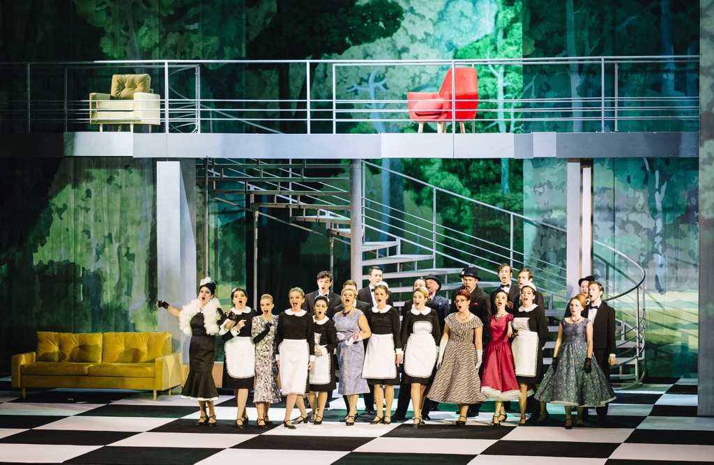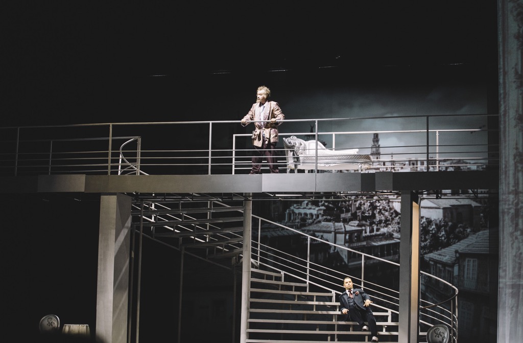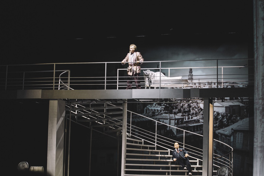 Из декораций – немного мебели в стиле 60-х, металлический мост и ведущая к нему большая винтовая лестница (на которой, кстати, певцам было крайне неудобно петь – подъем по рискованной конструкции отнимает дыхание и внимание, значительное время певец двигается спиной к залу, далеко от края сцены, и его просто не слышно). На задник и белые шторки по бокам проецируются кадры из знаменитых фильмов XX века, потом они превращаются в цветные гардины…