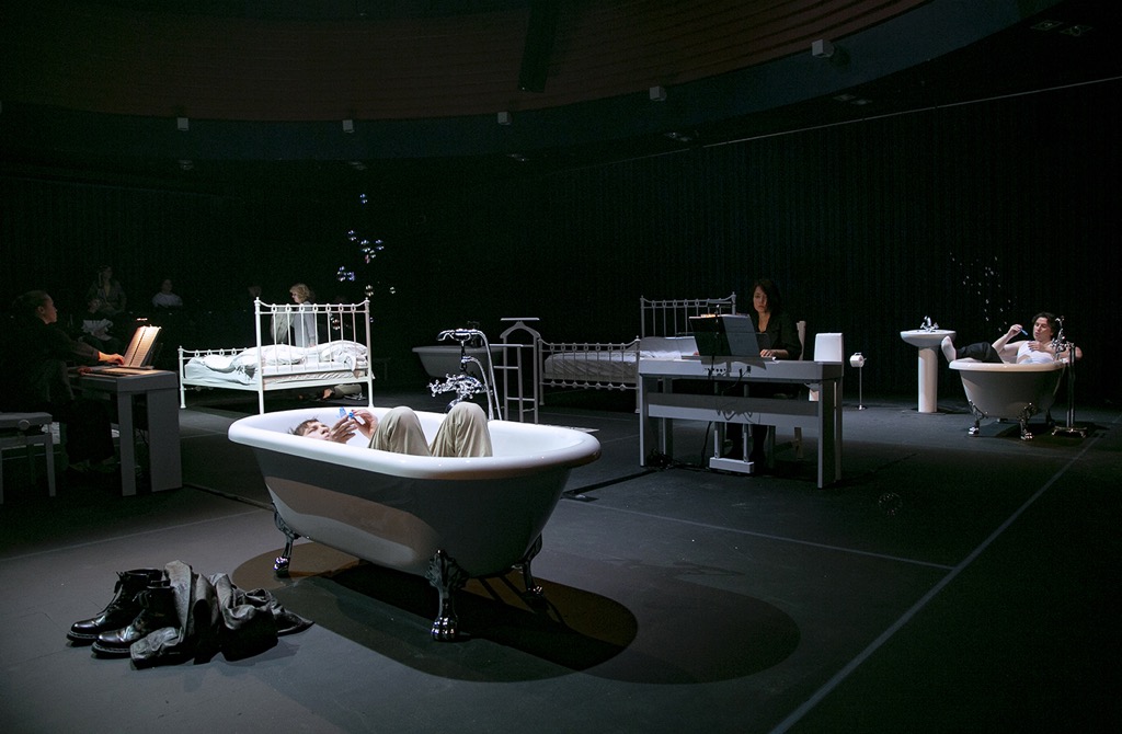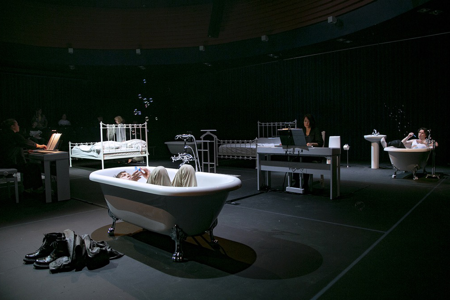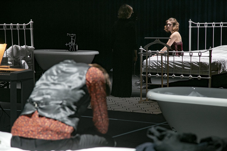 Всю «магию» искусно созданной матрицы иррациональной «игры» постичь можно лишь методом погружения. И хотя в ячейках матрицы игрового поля нет ничего, кроме кроватей, эмалированных ванн, сантехники, скупой меблировки, необходимого по сюжету реквизита, а также интегрированной во всё это «большой диагонали» из трех цифровых аккомпанирующих пианино, помехой к погружению в «игру» это абсолютно не является. Камерный формат опуса и адекватный формат его представления предлагает погружение практически бездистанционное: вместе с участниками весьма необычайной для оперного жанра «игры» зрители попадают в самый эпицентр смертельной схватки.