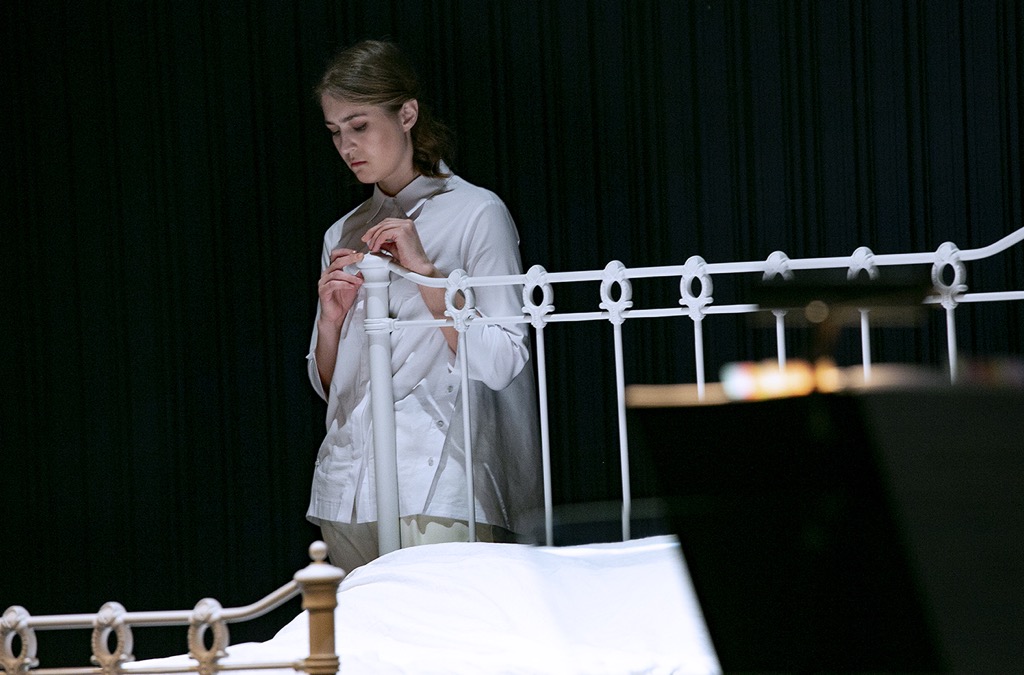 Реализовать мобильную, но при этом визуально емкую и психологически плотную концепцию режиссеру помогли сценограф Ксения Перетрухина, художник по костюмам Алексей Лобанов и художник по свету Евгений Ганзбург. Но что ни говори, при всей важности музыкального пласта главная игра нового премьерного проекта – режиссерско-сценографическая и драматическая. Статичная, словно застывшая фактура музыки Гласса, ее явно выраженная медитационная, «экспрессионистская» мелодекламационность – то, что музыканты и певцы постигли заведомо глубоко и мощно. Мозговым исполнительским центром однозначно инновационной для Москвы премьеры явилась Алевтина Иоффе, музыкальный руководитель и дирижер, а ее «оркестр», как было сказано ранее, на сей раз составили три цифровых пианино. На втором спектакле 13 марта их партии исполнили концертмейстеры Анастасия Зимина, Дарья Смирнова и Олеся Потапова, а состав певцов-солистов оказался следующим: Лиз – Людмила Верескова (сопрано), Поль – Денис Болдов (баритон), Жерар – Сергей Петрищев (тенор), Агата / Даржело – Анна Холмовская (меццо-сопрано). Партию Голоса рассказчика взял на себя Григорий Калинин.
