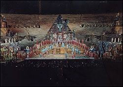 Арена ди Верона отмечает свой юбилей новой постановкой Аиды - оперы, для нее священной. Аида Франко Дзеффирелли сменяет "Аиду" Пьер Луиджи Пицци, рафинированный, тонкий, необычный для огромного огромного пространства спектакль. С постановкой Дзеффирелли в древний амфитеатр возвращается все несчетное количество раз виденное: подавляющие тяжестью и не блещущие открытиями декорации, превосходящее самое смелое воображение количество участников на сцене, певцы, во многом предоставленные самим себе.