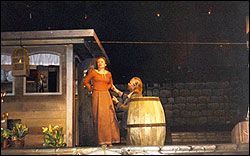 Ничего этого в нынешнем спектакле нет. Никакой полифонии образов, никаких вторых планов, никакой набережной. Всё на "пятачке" условной баржи и условного причала, объединенных вместе. И все герои постоянно стекаются на этот "пятачок" как на концертную эстраду, чтобы по очереди исполнить свой номер. А случайно забредшие сюда влюбленные, которым композитор дал маленькие, но символические роли, почему-то вообще поют за сценой! Так выдающийся мастер реализма, Борис Покровский, изменяет в этом спектакле сам себе. Его творчество здесь выглядит "усталым". Действие без глубины и перспективы становится "плоским" и от этого неестественным, исчезает контраст между городским бытом и одиночеством героев. Опера лишается одного из своих главных действующих лиц - Парижа. А такие его приметы, как лотрековские плакаты с Аристидом Брианом, выглядят формальным довеском.