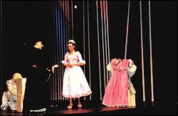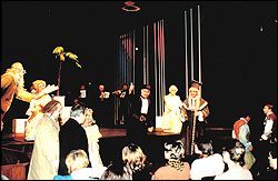 В выдумке триумвирату постановщиков (что-то новенькое!) в лице мэтра, а также И.Меркулова и В.Федоренко не откажешь. Нет смысла перечислять всяческие "приколы": от "бездонного" ящика, откуда актеры черпали реквизит, и куда в одночасье свалился граф, до незатейливых ковриков-плакатов с комментариями о начале и конце актов. Актерские хохмы сыпались как из рога изобилия. Керубино, "прячущийся" за платьем, которое он сам и держит в руках, Фигаро, которого новоявленные родители одевают в слюнявчик и чепчик, чтобы попоить молочком. Выбор все же был сделан в сторону фарса. Хотя это стало окончательно ясно только в 3-м и 4-м актах, где фантазия авторов спектакля разыгралась не на шутку. Пошел гулять по сцене и фойе оркестр, концертмейстер и дирижер плавно вливались в актерский ансамбль. В общем, "пошла плясать губерния"! В такой обстановке драматического спектакля невольно начинаешь ждать от исполнителей отменного актерского мастерства. Уже второй раз за короткое время я сталкиваюсь с такой ситуацией. Недавно "Летучая мышь" "у Станиславского", теперь вот "Фигаро". Что здесь скажешь? Женская половина (на данном представлении 17 февраля) справлялась со своими задачами лучше. Живость и лукавство Сюзанны (Ю.Моисеева), шаловливость Керубино (А.Утенова), вздорность Марселины (К.Муравьева), внутренняя сдержанность и благородство Графини (О.Лесничая) вполне просматривались в этом водовороте событий. Исключением была лишь Барбарина (Т.Шпакова), некоторая "брутальность" которой озадачивала (возможно, это был ход "от противного", но очень уж невнятный). С "мужскими достоинствами" (да простят мне эту вольность, как говорится, с кем поведешься...) дело обстояло немного хуже. Граф Альмавива (И.Кожинов) своей скучающей "медальностью" напоминал А.Гомиашвили в роли Остапа Бендера, изображающего страсть к мадам Грицацуевой. Что ж Фигаро? Понятно, что Фигаро Моцарта гораздо менее плутоватый и более остепененный, нежели Фигаро Россини, но не до такой же степени! Причем вины А.Мочалова я тут не усматриваю, такова, видимо, была "сверхзадача" триумвирата. Бартоло (С.Васильченко) и Базилио (С.Остроумов) выглядели трафаретно. Остальные роли - менее значимые.