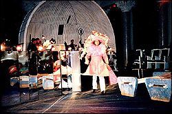 Несколько слов о сценографии (художник Д.Черняков). Она, в целом, читаема, что уже неплохо, хотя и лаконична. Имитация парковой эстрады, где восседает оркестр, вкупе с садовыми скамейками должны олицетворять провинциализм маленького театрика (см. цитату), отчетливо угадывается и Берлинская стена, символичен "совковый" ковер.