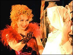 За последний сравнительно короткий период я посмотрел три буффоных сочинения. Кроме последнего это: "Обручение в монастыре" Прокофьева (театр Стаинславского) и "Фальстаф" (в том же "Геликоне"). И здесь напрашиваются такие сравнения. Опера Прокофьева - это все же сочинение, написанное современным языком, его буффонность носит скорее реконструктивно-стилизаторский характер. На этом "разломе" любые аллюзии в современном духе, эксперименты со сдвигами во времени естественны. Поэтому когда Дуэнья занимается аэробикой, это не только смешно, но и вполне уместно. Другой стилевой "разлом" у Верди. Он пытается идти вперед, язык совершенно новый для 19 века, да и настроение в музыке отнюдь не смешное. В этот "зазор" между музыкой, стилем и смыслом Бертман мастерски вклинивается со своей неуемной фантазией. Что же касается доницеттиевского опуса, то здесь простора для современных режиссерских экспериментов, на мой взгляд, значительно меньше. Буффонность Доницетти изящна и стилистически выдержанна сообразно существующим в то время традициям. Ее не надо понимать как буквальное "руководство к действию". Это просто условная "игра" в рамках предлагаемых эпохой жанров. А основная цель все же иная и более типичная для эпохи бельканто. Это (извините за банальность) виртуозный певческий "кунстштюк". Поэтому, обозначив, разумеется, буффонность, обогатив ее умеренным современным подтекстом, эту оперу прежде всего надо виртуозно и стилистически выверенно спеть, выявив все ее музыкальные красоты!