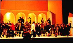 Что же дальше? Режиссер не давал расслабиться публике. Весь стиль сценического поведения артистов, включая выражение эмоций, был пластически организован. Кажущиеся вычурными угловатые, а порой и грубоватые движения хористов и солистов отражали изгибы музыкальных фраз. Вся эта "хореография" (как прошептал раздраженно мой сосед по премьере) была диаметрально противоположна той помпезной и внешней по отношению к действию "балетизации", которую недавно можно было наблюдать на премьере "Набукко" в Большом театре. Правильнее было бы сказать, что здесь мы наблюдали ритмопластическую визуализацию чувств, заложенных в самой музыке. Движения как бы вырастали из музыкального материала, а не иллюстрировали его. Причем, музыка Масканьи с ее аффектами, "рыданиями", резкой сменой настроений, выражающая необузданность любовных желаний, стадность примитивных чувств толпы, была благодатным материалом для такого обращения с ней.