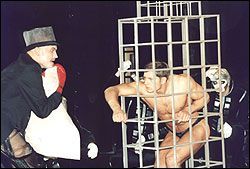Известно, что берговский оперный стиль обычно числят по "ведомству" экспрессионизма. Экспрессионизм всегда "акмеистичен" и проявляется в формалистической стильности происходящего (если речь идет о театре). Эклектические метафоры-символы ему чужды. А в происходящем на сцене "Геликон-оперы" больше заметны символические (бодибилдинг, микрофоны и др.) и сюрреалистические намеки (манипуляции с картиной Магритта, к примеру). Нет ли тут противоречия? Если вынести за рамки языковую проблему (спектакль идет на русском языке), то нет. Ибо прямолинейный перенос терминов изобразительного искусства на музыку (это касается, кстати, не только экспрессионизма, но и барокко, классицизма, импрессионизма) всегда приводит к вульгарному результату и пошлым спекуляциям. Касательно же исполнения на немецком языке, с его шипящими согласными, придающими и самой музыкальной ткани особое своеобразие, то здесь при переводе на русский проблема возникает. Но не следует драматизировать ситуацию и предаваться чрезмерному пуризму - компромисс вполне допустим, особенно в отсутствие устоявшихся традиций, а выигрыш для зрителя ощутим - все-таки можно понять, о чем идет речь на сцене.