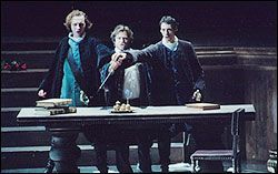 Об этом "Бале-маскараде" мы уже писали. Его пармская премьера вызвала много разноречивых откликов. И вот спектакль добрался до родной гавани. Причем, можно сказать, в буквальном смысле этого слова. Ибо, привязавшись к возникшей у Верди "на горизонте" (по известным цензурным обстоятельствам) американской почве, режиссер придал спектаклю "морской аромат". Желая, видимо, придать какую-то романтически-фатальную ноту спектаклю, Кончаловский, по справедливому замечанию Петра Поспелова ("Известия" от 15 мая с.г.), привнес в него "неуместные вагнеровские ассоциации".