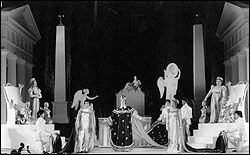 Кому, как не этому изысканнейшему поэту красоты, могло быть поручено создание спектакля, вызывающего к жизни придворные празднества по случаю сиятельных свадьб или рождений? Волею Пицци вы переноситесь в иной, навсегда потерянный мир. Ослепительный белый цвет доминирует в представлении, оттененный умеренным количеством красного и золотого, между двумя одинаковыми храмами устремляется ввысь обелиск, боги появляются на движущихся тронах, прямо из сцены начинают бить фонтаны, оркестр сидит в полукруглой яме, и ее обрамление служит артистам для остроумных мизансцен и поклонов публике.