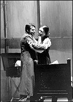 Режиссура А.Тителя всегда стремится подчинить все внешнее внутренней идее. Что имеется в виду? Недавно в статье о Бобе Уилсоне одним критиком справедливо были отмечены характерные черты этого знакового (и для оперы в том числе) режиссера: антипсихологизм, автоматизм актеров (как тут не вспомнить эссе Г.фон Клейста "О театре марионеток"), ничего естественного на сцене, относительное безразличие к тексту при самодостаточности внешней "картинки" спектакля. Это один тип театральной эстетики. Я сознательно остановился на нем, ибо иногда отчетливее можно понять почерк художника "от противного", т. е. обрисовав то, что ему чуждо. Так вот, принципы Тителя - противоположны вышеизложенным. Он всегда определяет внутренние задачи и, в зависимости от них, гибко выбирает стилистику. Все зависит от характера спектакля (например, "Обручение в монастыре" нелепо было бы превращать в психологический триллер, здесь жанр требовал массы внешних ироническо-комических деталей). Но в нынешнем случае была выбрана именно психологическая, а не гротескно-эпатажная модель - драматургическая основа (проза Достоевского) это допускала, если не сказать - требовала. Выстроить отношения и переживания героев, добраться до личностей! Отсюда результат: удачно и убедительно (а, подчас, и блестяще) выглядят монологи и диалоги, немного бледнее - массовые эпизоды со сложными мизансценами. Главный среди них - сцена рулетки - получился пресноватым, зрелищно вялым и монотонным. Не нашлось театральных средств сделать этот эпизод контрастным и многоплановым. Крутящийся и неумолимо "шуршащий" помост с декорациями - эффектная и значимая конструкция художника - в данном случае лишил режиссера необходимого пространства, вытеснив участников игры, практически, на авансцену. Не использованными здесь оказались и ресурсы световой режиссуры. При всем этом необходима оговорка - разговор идет по большому счету - надо понимать, что даже не совсем удачные места у Тителя я предпочту "удачам" экспериментаторов западного и отечественного "разлива".